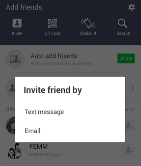 Invite your friends STEP1 : Tap "Add Friends". STEP2 : Tap "Invite". STEP3 : Select friend STEP4 : Select Text message or Email STEP5 : Send a Message to your friend