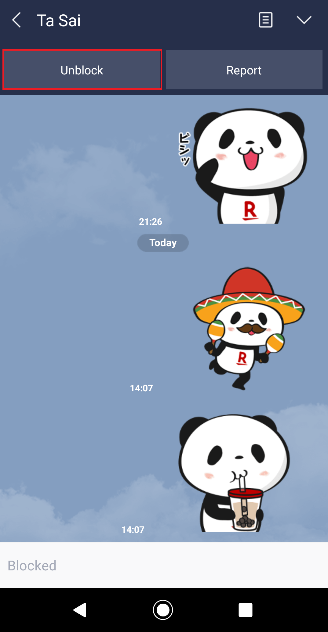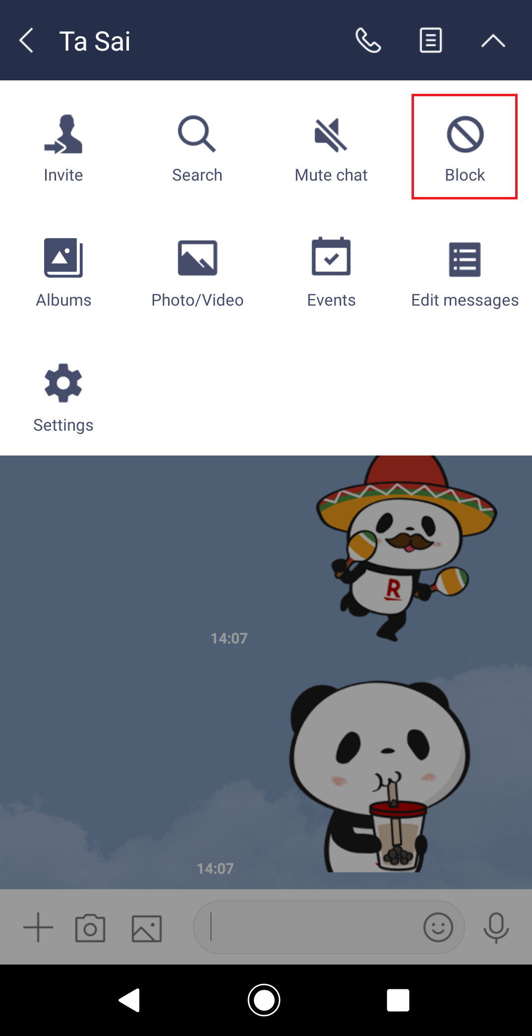 Block a friend STEP1 : Tap "∨" on Talk screen menu of the other party you want to block. STEP2 : Tap Block. ・Tap Unblock if you want to unblock.
